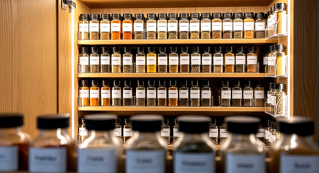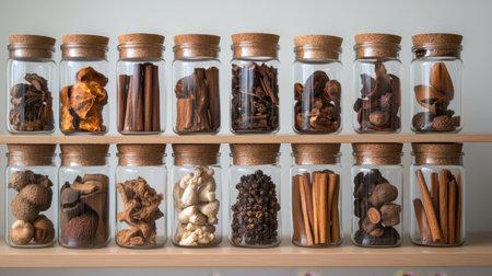 A shelf full of glass jars with various herbs and spices. The jars are arranged in rows, with some jars containing dried herbs and others containing spices. Scene is one of abundance and variety