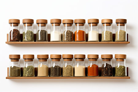 An overhead shot reveals neatly arranged glass jars filled with various spices, displayed on wooden shelves against a white wall. The composition highlights the diversity of colors and textures within the jars, suggesting a well-organized kitchen or pantry. Suitable for culinary, food, or lifestyle publications and projects.