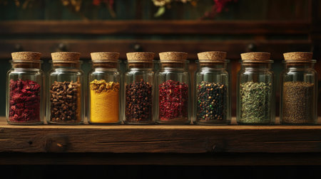 A beautiful arrangement of colorful spices and herbs displayed in glass jars with cork lids on a wooden table, showcasing vibrant colors and textures.