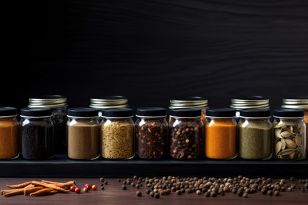 Dynamic Spice Ensemble: Up-close composition highlighting the dynamic arrangement of diverse spices in containers on a sophisticated black wooden setting