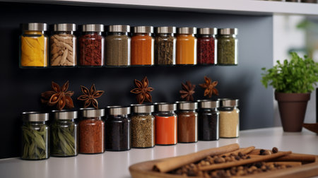 A vibrant array of spices displayed in glass jars lines a modern kitchen counter. Each jar contains a different spice, adding to the culinary allure and creativity in cooking.