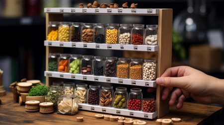 An AI generated illustration of An assortment of spices stored in clear containers arranged in an artful display