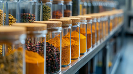food quality control, in a food quality lab, spices and ingredients are neatly arranged in glass jars for precise testing and measuring of food products