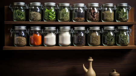 Rustic kitchen shelf with glass jars of herbs and spices in cozy vintage setting. That the image is generated using AI.