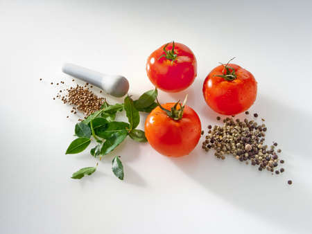 Fresh tomatoes and spices on white background