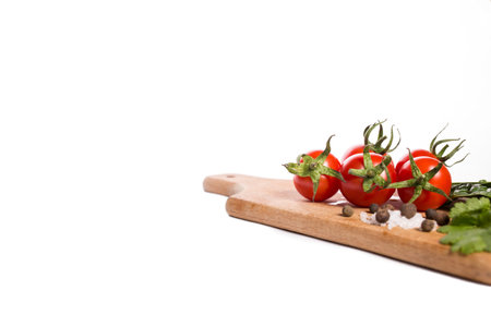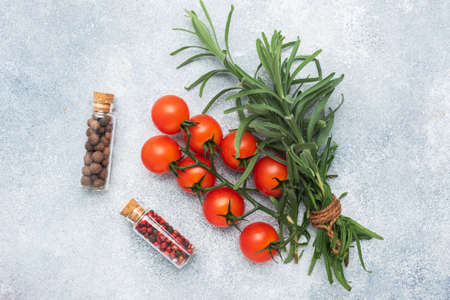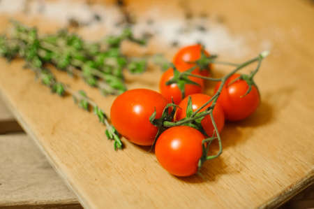 Cherry tomatoes with herbs and spices on kitchen board. Cherry tomatoes with copy space