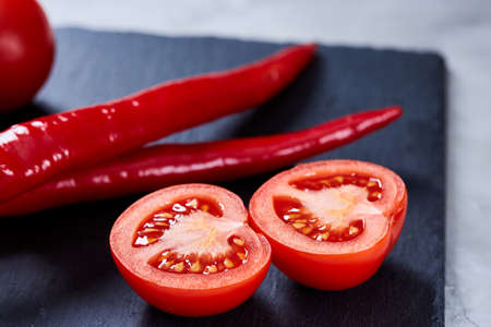 Top view of fresh red tomatoes and hot chili peppers on a black stone background. Nutritious, and spicy vegetable ingredients.