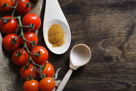 The wooden spoons with spices, paprika, basilic, pepper, thyme with cherry tomatoes