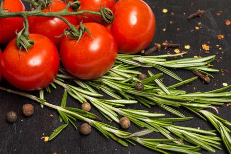 closeup photo, branch of ripe red cherry tomatoes, fresh rosemary, sprinkled with allspice, cloves, on dark wooden board food photography