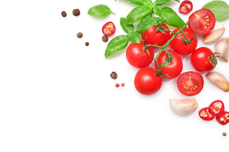Ingredients for cooking, garlic, tomatoes, spices and herbs isolated on white background. Top view.