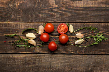 red chili and tomato, salt, garlic, rosemary on a dark wooden background; ingredients for cooking; cover cookbook; asian cuisine, free space for text