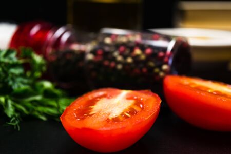 Half a tomato lies on a cutting board on a dark background. Ripe vegetables. Tomato set. Dark background. Healthy diet. Vegetarian food. Healthy diet. The design concept of the product.