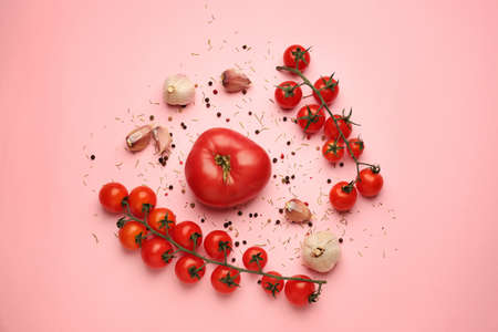 Fresh tomatoes and spices on color background