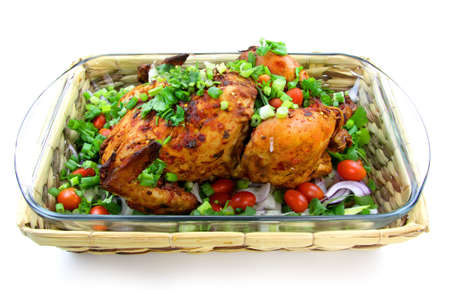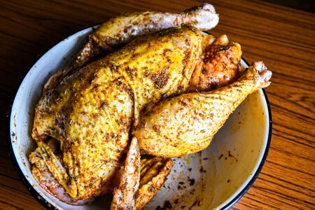 Food concept homemade Roasted, Grilled Whole organic chicken on white ceramic plate