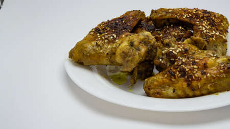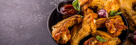 Barbecue chicken wings. Oven baked chiken on plate. Hot korean food. Top view, copy space