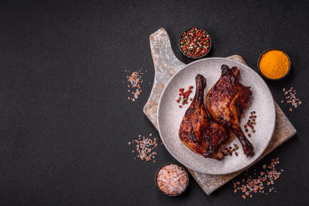 Duck, chicken leg or thigh grilled on a dark concrete background. Duck confit, Asian food with salt and spices
