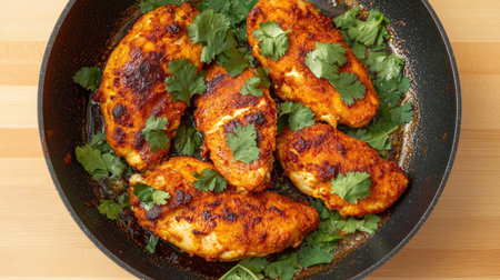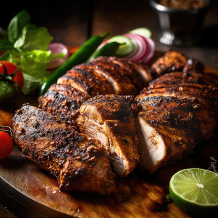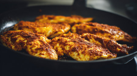 Chicken fillet grilled with spices and chilli. Macro filming.