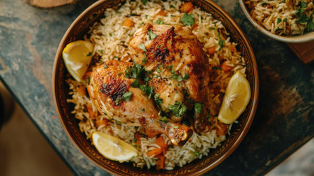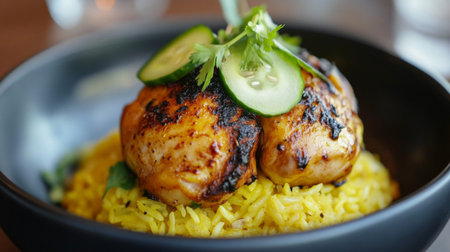 Roasted tandoori chicken with basmati rice on wooden table. Top view