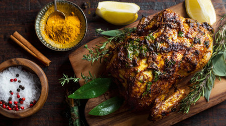 Whole grilled chicken with crispy golden crust skin served with barbecued zucchini, carrot, corn, cutlery and spices assortment on dark table, top view, copy space