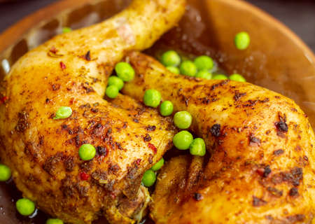 The horizontal photo shows a picture of food. This is home-baked chicken meat baked in the oven. The meat contains spices and green peas. The chicken has a golden crust