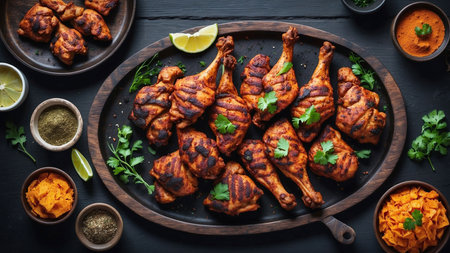 Grilled chicken drumsticks or legs or roasted bbq with spices and tomato salsa sauce on a black plate. Top view with copy space.