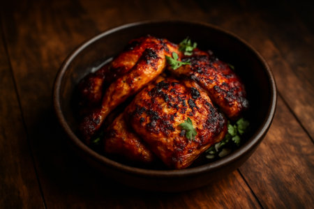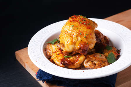 Food concept Roasted spicy chicken thighs on ceramic plate on wooden board with black background with copy space