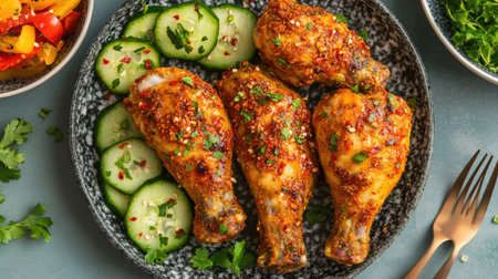 Grilled bbq spicy chicken legs on a metallic background. Top view.