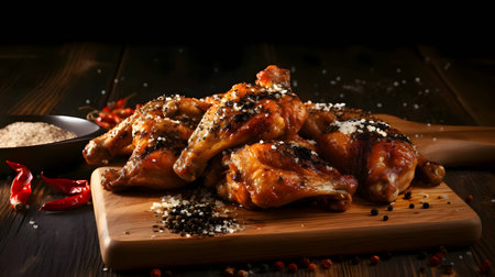 Fried chicken wings on black plate with lemon chilli herbs and spices / Baked chicken wings BBQ