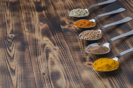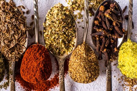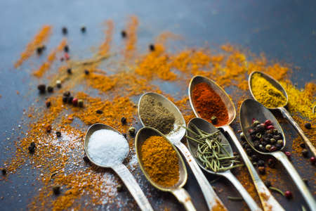 variation of spices on the vintage silver spoons, all spices on the table, colorful food background