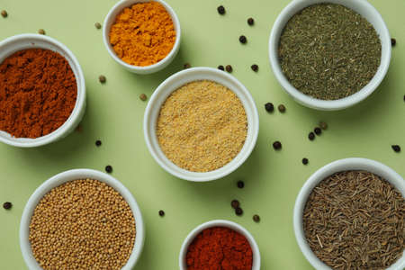 Spices and herbs in bowls. Food and cuisine ingredients. close up