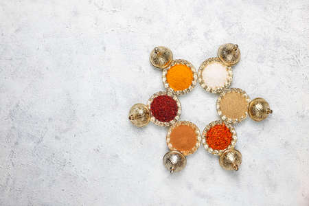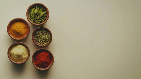 Top view of Indian condiments in small bowls, clean background, no people, copy space