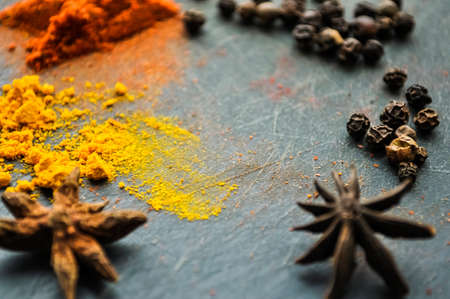 Colorful still life with different types of aroma spices. Vibrant colors of paprika, turmeric, chili pepper and anise star. Beautiful composition of spices.