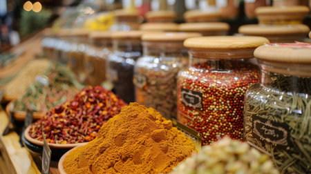 Explore a vibrant array of spices beautifully arranged in jars showcasing culinary diversity.