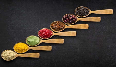 Various colorful herbs and spices for cooking in spoons. Pepper, chili, paprika, basil, turmeric.