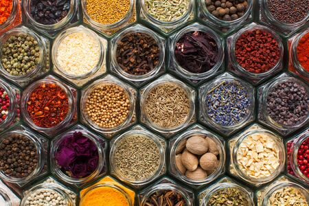 Herbs and spices in open glass jars, top view like a honey comb. Diversity of condiments