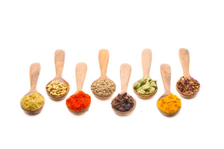 Collection of 18 spices on a wooden spoon. isolated on a white background