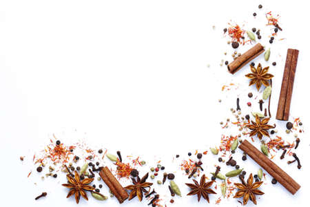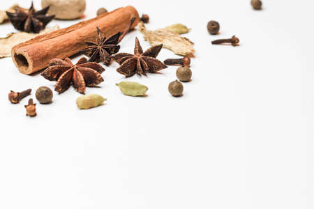 Spices scattered over white textured background, top view, close-up, selective focus. Cinnamon, peppercorns, star anise and bay leaf assorted on seasoning background. Some copy space for your text. Food background.