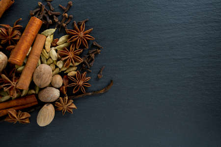 Spices and herbs on a black background. Food and cuisine ingredients.