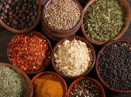 Spices and herbs in bowls. Food and cuisine ingredients. close up