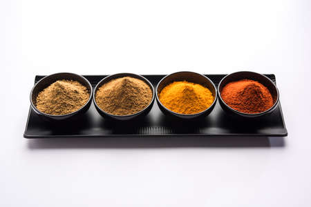 Indian colourful spices. Group photo of four basic Indian spices like raw red chilli, turmeric, coriander and cumin powder. selective focus