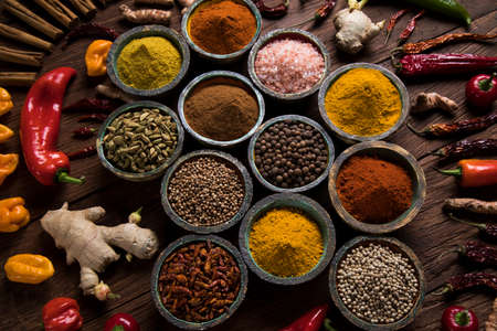 Condiment of indian food Spice garnish background on wood table top view. Seasoning of Asian organic herb cuisine flavour in kitchen board, chilli spicy taste concept