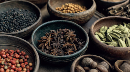 A stunning assortment of spices in rustic wooden bowls showcasing the beauty of culinary ingredients. Perfect for cooking and presentation.