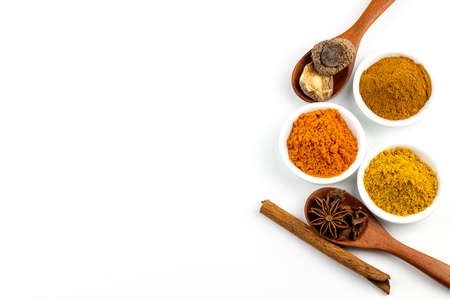 Collection of 18 spices on a wooden spoon. isolated on a white background