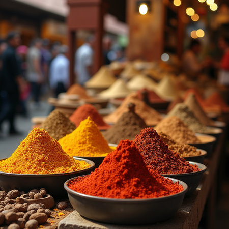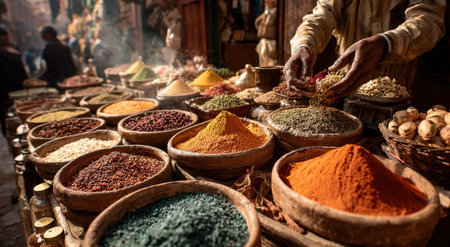 Colorful spices arranged in bowls, with a vendor measuring spices, creating a lively market atmosphere filled with rich textures and enticing aromas