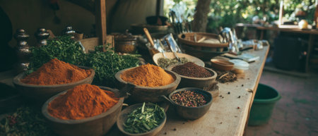 A vibrant display of various spices arranged in bowls. This image captures the rich colors and textures of spices, showcasing culinary diversity and rustic charm.