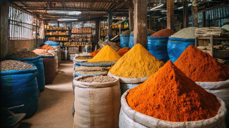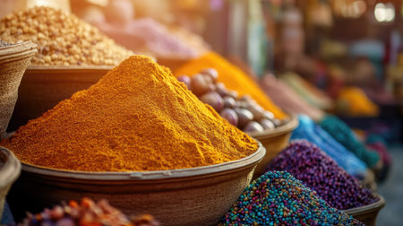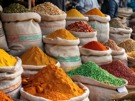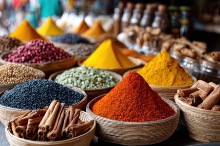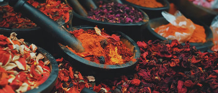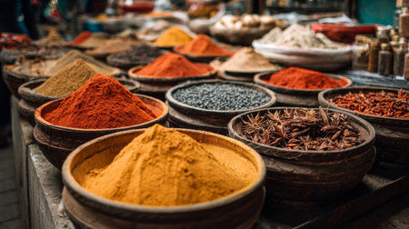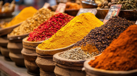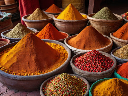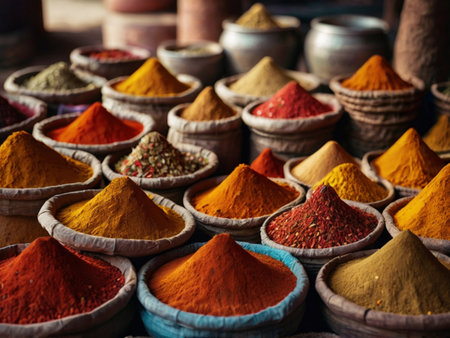 Colorful spices arranged in a market stall, their vivid colors and rich aromas filling the air in a traditional spice market