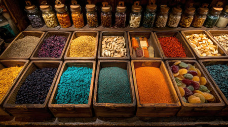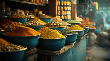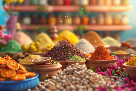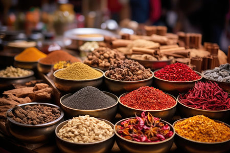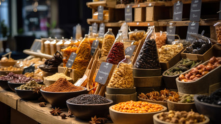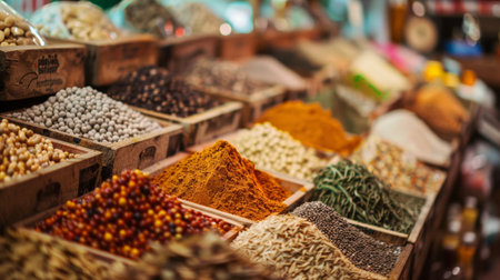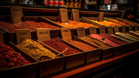 A variety of spices are on display at a orient market created with generative AI technology