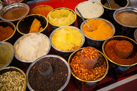 Colorful spices on the market in India. Selective focus.