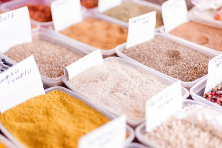 counter with colorful and aromatic oriental spices on the market.