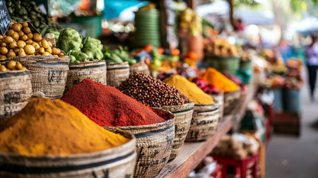 Explore vibrant aromatic herbs and spices at a bustling culinary market